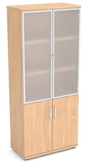Dwuskrzydłowe drzwi wykonane są ze szkła mlecznego osadzonego w aluminiowej ramce. Brak zamka pozwala na wygodny, szybki dostęp do dokumentów lub materiałów, które chcemy mieć na widoku. Idealne do prezentacji segregatorów, katalogów czy materiałów firmowych.
